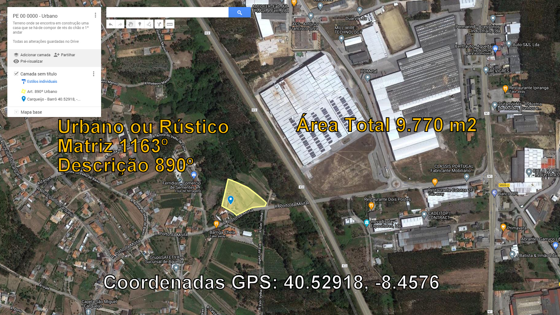 Descrição PRÉDIO URBANO - Terreno onde se encontra em construção uma casa que se há-de compor de rés do chão e 1º andar sita na freguesia de Barrô, concelho de Águeda com área total de 9770 M2, a confrontar do Norte com Joaquim Rodrigues Caixa; do Sul com caminho; do Nascente com rego foreiro e do Poente com Artur dos Anjos Torrado, inscrito na Matriz respetiva sob o art. 1163.º (união de freguesias de Barrô e Aguada de Baixo) e descrito na Conservatória do Registo Predial de Águeda sob o n.º 890.